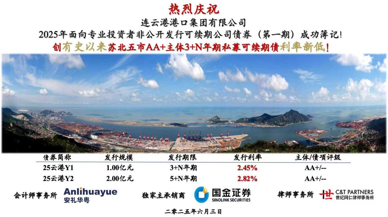6月3日,连云港港口财务公司成功助力连云港港口集团成功发行3亿元非公开可续期公司债券。本期债券设置双期限结构,其中3+N年期限品种票面利率2.45%,5+N年期限品种票面利率2.82%。创有史以来苏北五市AA+主体3+N年期私募可续期债利率新低!