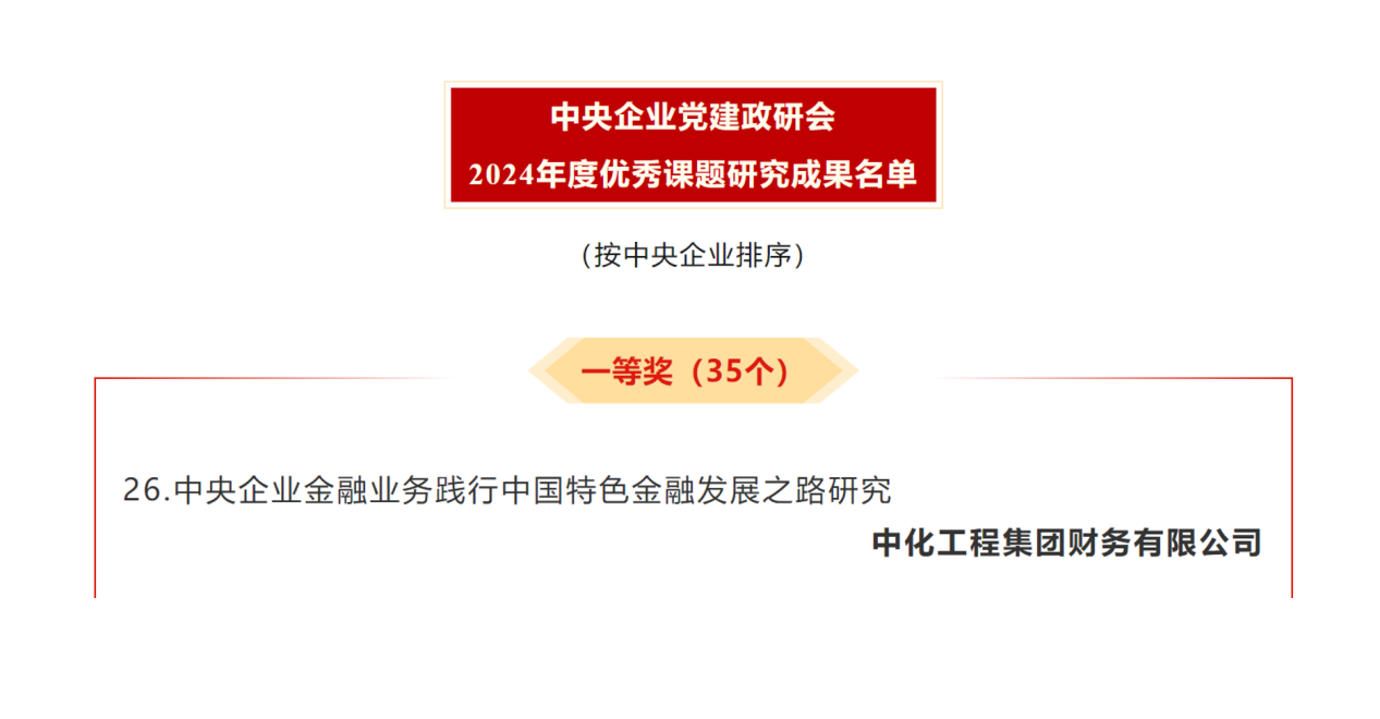 近日,中央企业党建思想政治工作研究会发布2024年度优秀课题研究成果名单。由中国化学申报、中国化学财务公司负责实施的《中央企业金融业务践行中国特色金融发展之路研究》荣获一等奖,这也是中国化学在此项工作中首次获得一等奖的好成绩,理论研究取得历史性突破。