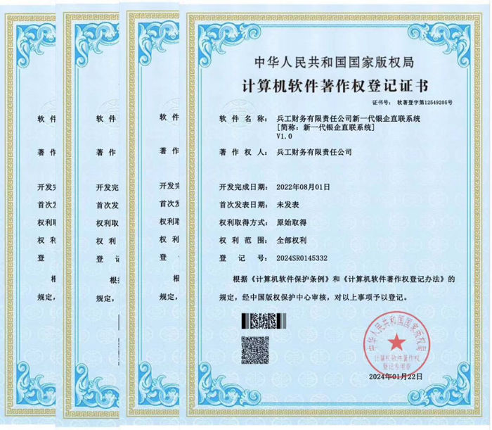 截至目前,兵工财务公司拥有的软件著作权登记证书已达26项,软件著作权登记证书的取得,是兵工财务公