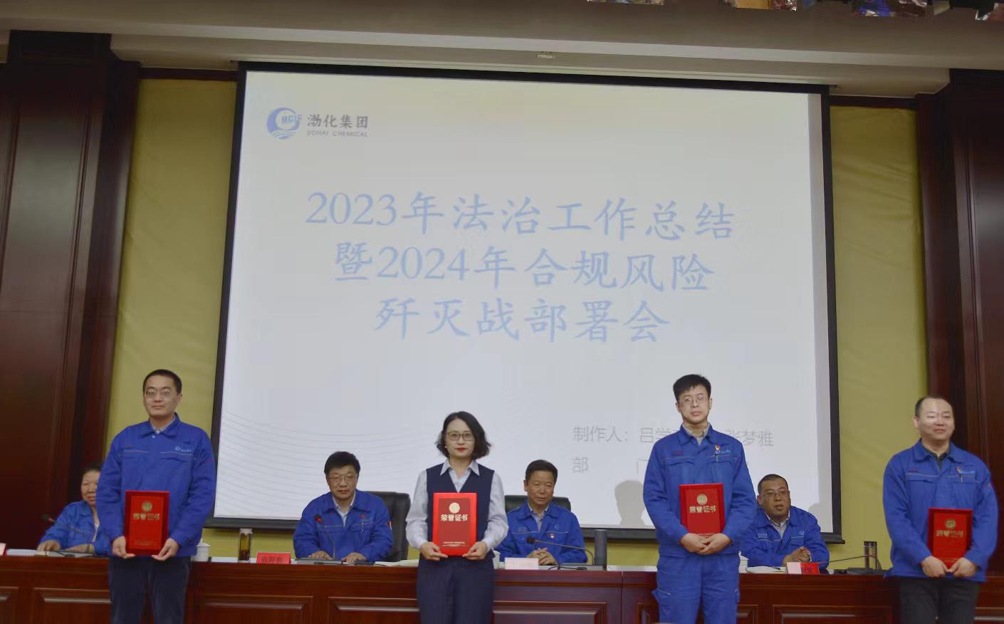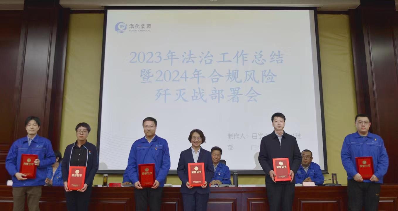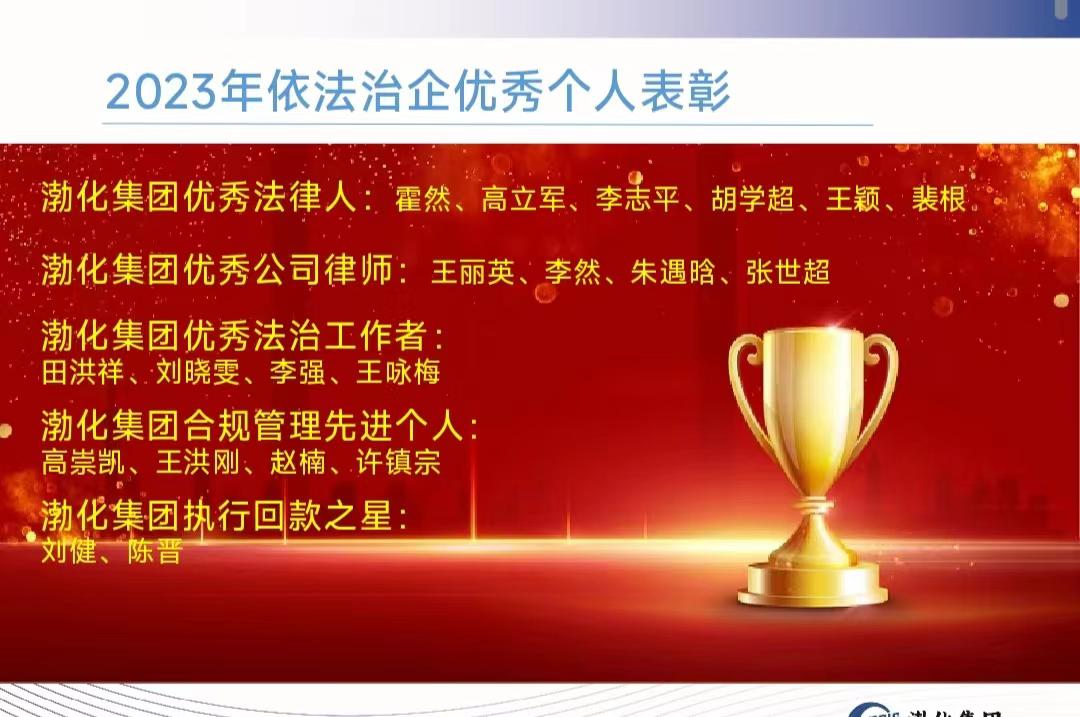 集团依法治企优秀个人表彰。李志平同志获得渤化集团优秀法律人称号,赵楠同志获得渤化集团合规管理先进个