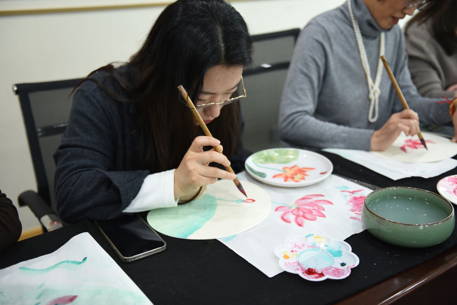 女职工们在老师的指导下,以“莲”为主题,拿起画笔认真勾勒、专心渲染,将莲花、莲蓬、莲叶等元素融入创作