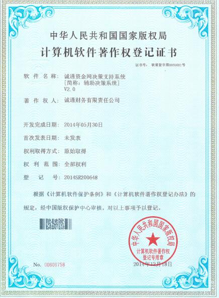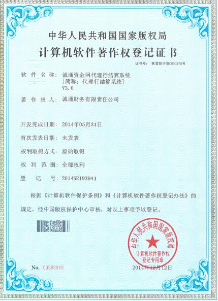 2014年12月26日,诚通财务公司收到国家版权局计算机软件著作权登记证书。财务公司自主研发的诚通资金网代理行结算系统与辅助决策系统通过中国版权保护中心审核(软著登字第0863175号,0869881号),著作权人为诚通财务有限责任公司,财务公司拥有全部权利,是财务公司行业中继中国石化财务公司后第二家自主研发资金结算系统的财务公司。诚通资金网的建设符合银监会自主研发核心系统,防范科技风险的政策导向,引起北京银监局、财务公司协会的关注与肯定,未来在行业内推广具有良好的商业前景。证书的取得标志着国家主管部门对财务公司独立研发信息系统能力的认可,为进一步完善创新系统功能,建设诚通资金网奠定了坚实基础。