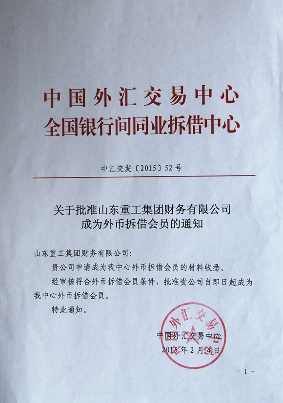 在山东重工财务公司积极申请和推动下,2015年2月5日中国外汇交易中心正式批准财务公司外币拆借会员资格。