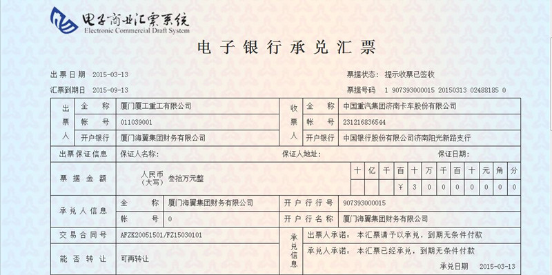 2015年3月13日,在我司成员单位厦工重工的积极推广下,我司成功为厦工重工开具了一笔电子银行承兑汇票,收款人为“中国重汽集团济南卡车股份有限公司”,期限为6个月,金额为30万元。这标志着我司开具的电票真正进入了金融市场流通领域。