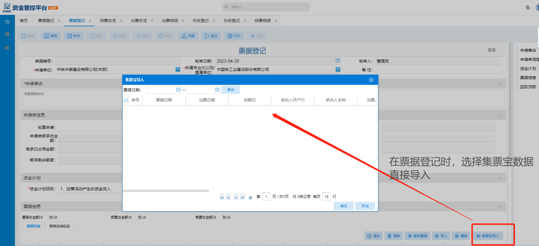 应收票据登记或应付票据开立时,可通过【集票宝导入】按钮,引入集票宝中的持票、出票数据,在集票