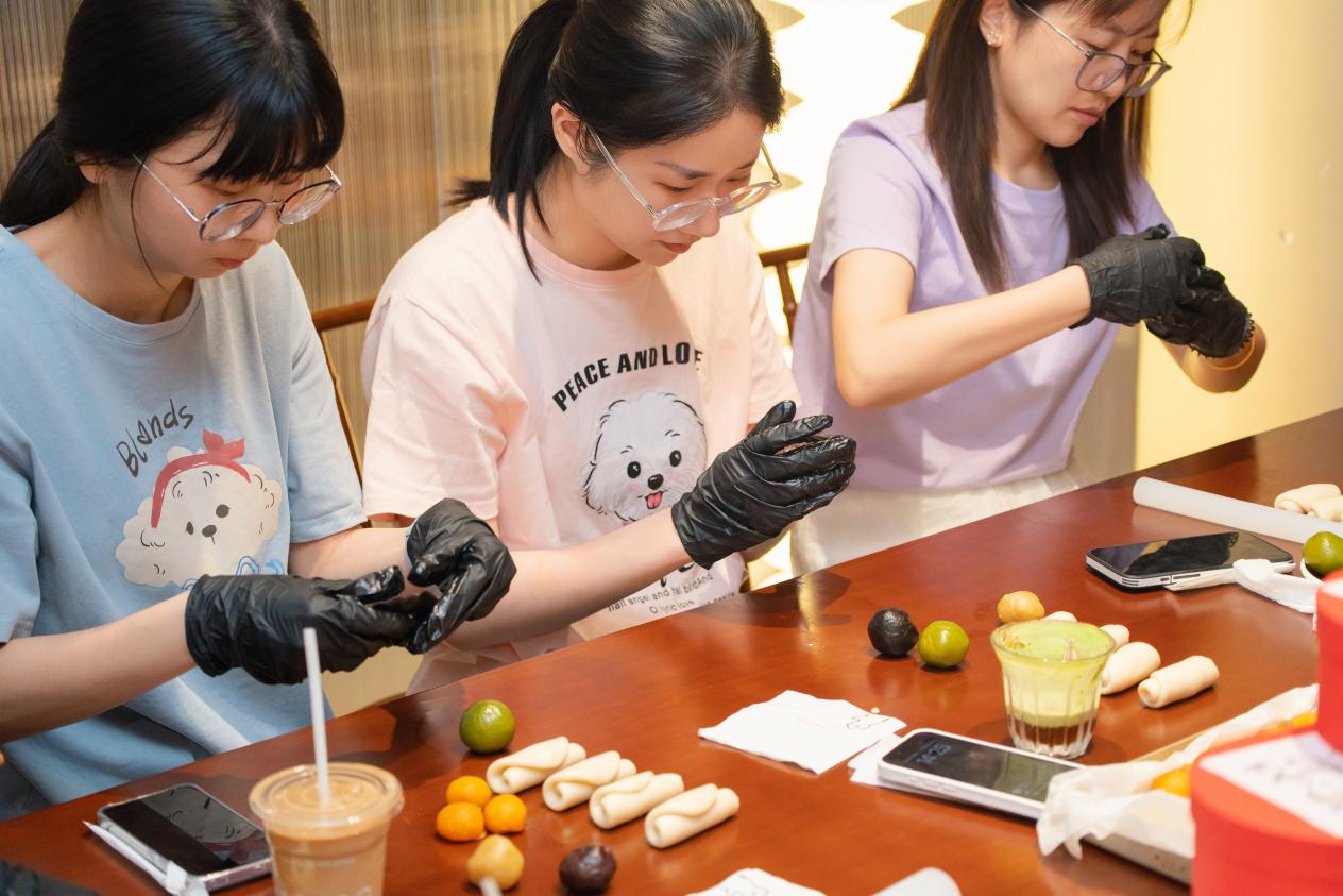 来到活动现场,操作台上已经整齐摆放了低粉、黄油、流油咸鸭蛋,以及豆沙、莲蓉、乌龙、芝麻等馅料。大家迫不及待地戴上手套开启制作,从揉捏油皮油酥,到小心翼翼地包蛋黄,再到最后刷蛋液、撒黑白芝麻、南瓜子……每一步都做得分外用心。