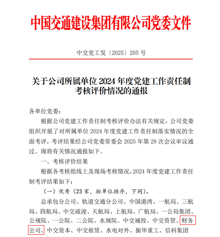 近日,中交集团党委公布所属单位2024年度党建工作责任制考评结果,财务公司党委再次获评“优秀”等级,实现“五连优”。