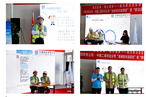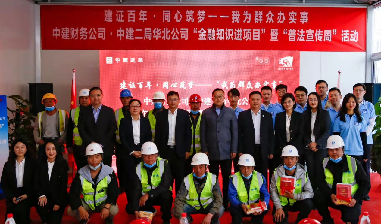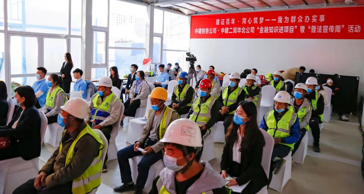 【党史学习教育开展以来,中建财务公司认真落实“我为群众办实事”实践活动,积极发挥金融宣传功能,启动了“金融知识进项目”活动,与成员单位合作联动,组织青年志愿者到项目为一线职工和务工人员普及金融常识,以党建促联系、促交流、促发展,持续擦亮“建证”党建工作品牌。】10月22日下午,由中建财务公司发起并与中建二局华北公司共同主办、人民银行营管部指导的“金融知识进项目”暨“普法宣传周”活动在中建二局海淀永丰项目成功举办。中国人民银行营业管理部法律事务处(金融消费者权益保护处)副处长董英超、宣传教育科科长芮思学,中建财务公司、中建二局华北公司及北京分公司、北京盈科律师事务所等有关负责人,项目职工及务工人员40余人参加现场活动。