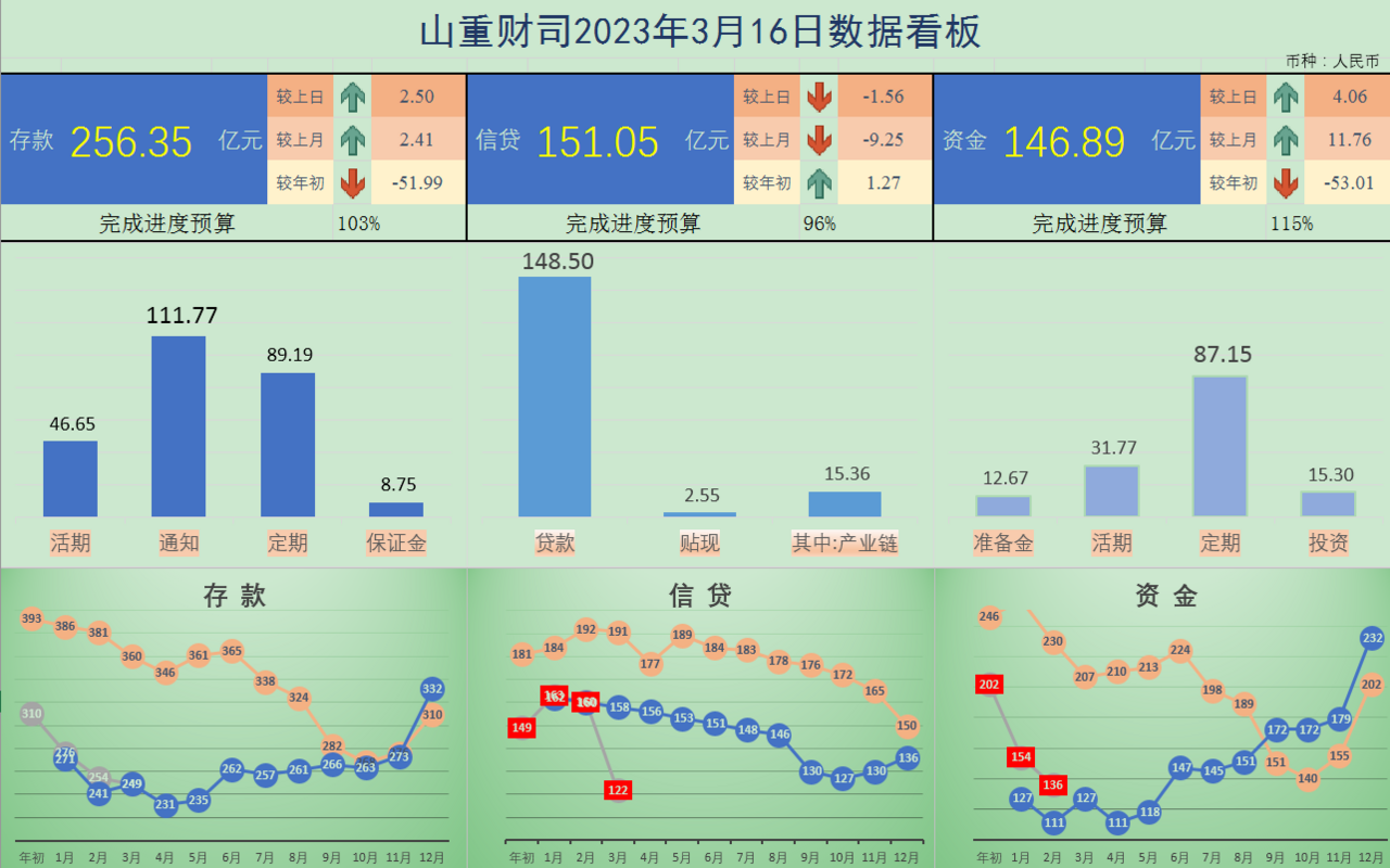 柱形图的形式展现,资金的来源和投放主要构成一览无余。存款、信贷、资金的年度预算和进度情况也趋势线