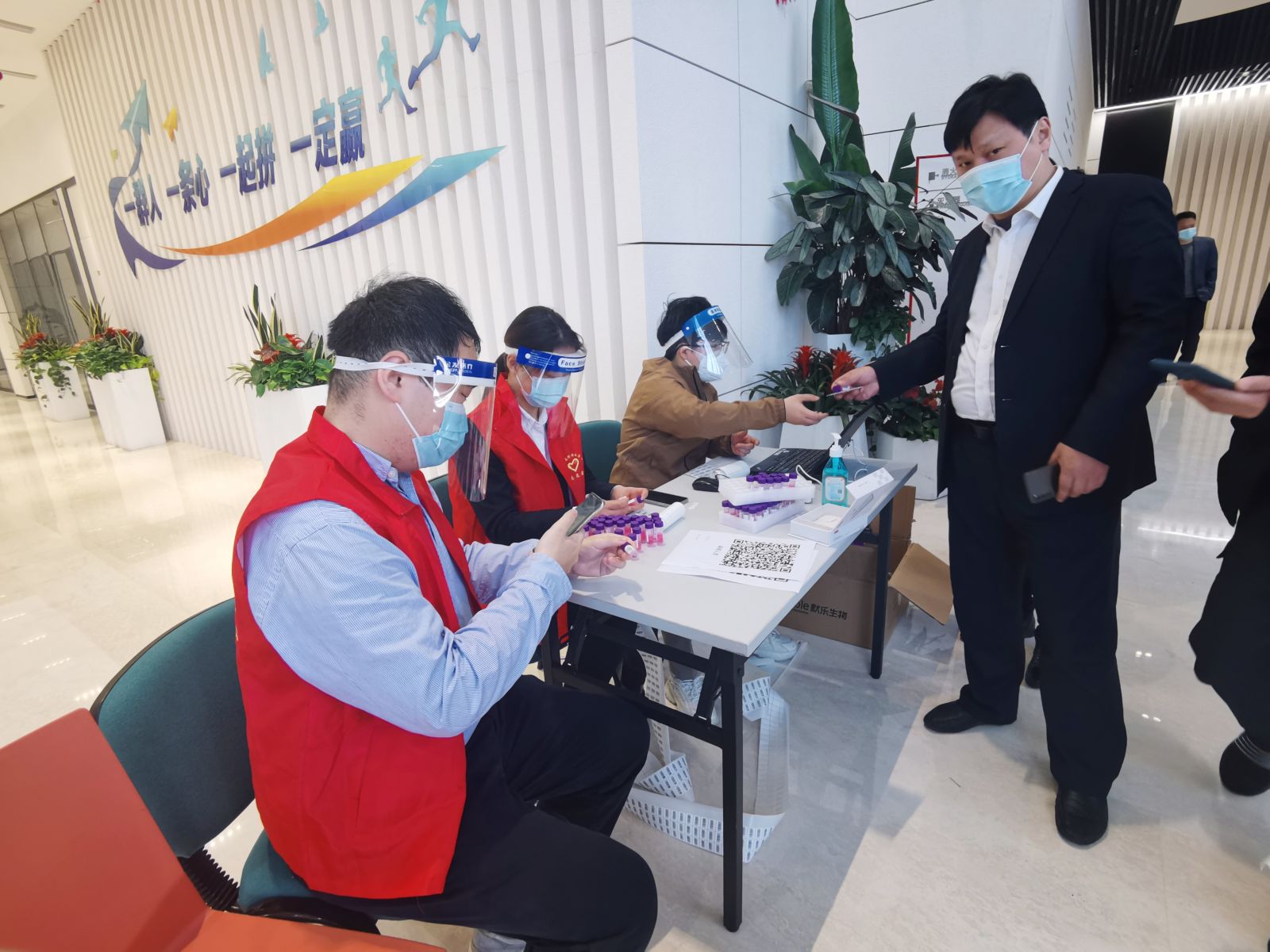在现场,志愿者们全力以赴,紧张有序地开展工作:讲解检测流程、维护检测秩序、录入检测信息等,服务细致、温馨,圆满完成任务。