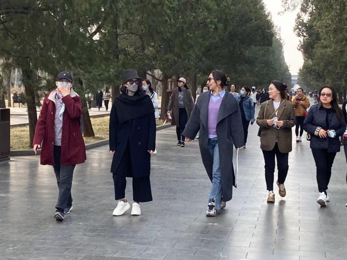 “巾帼健步走”活动。红墙碧瓦,古树参天,大家欢声笑语健步走在天坛公园的林荫大道上。清新的空气洗涤