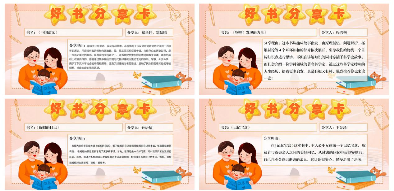 力量》、《蚯蚓的日记》……,并与家长共同填写“好书分享卡”。一本本故事书拉进了父母与孩子的距离,在启