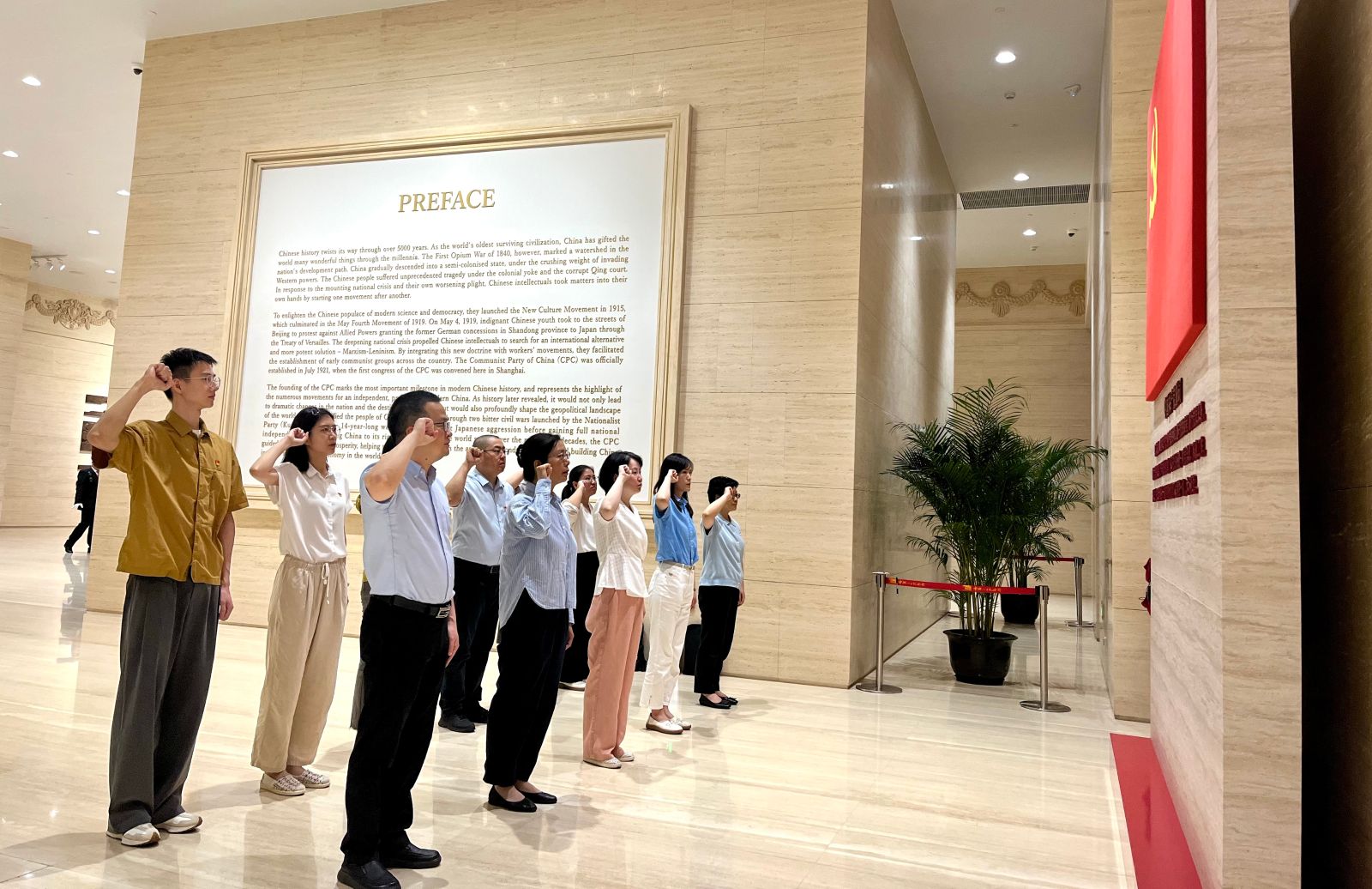 全体党员通过馆内珍贵的文物实物、详实的档案资料、生动的图片视频,全方位回顾了中国共产党从“前仆后继、救亡图存”的建立初期发展到现如今“砥砺前行、光辉历程”的新时代,系统地学习了中国共产党的艰辛历程。在纪念馆宣誓厅内,面对鲜红的党旗,全体党员庄严举起右拳,重温入党誓词:“我志愿加入中国共产党……随时准备为党和人民牺牲一切,永不叛党。”铿锵有力的誓言回荡在展厅,表达了全体党员对党的忠诚,进一步坚定理想信念。