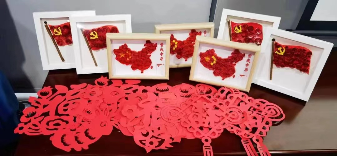 张福兔、福字剪纸、中国地图衍纸作品,参会人员用自己创作的作品表达着对党和国家的真挚热爱与美好祝
