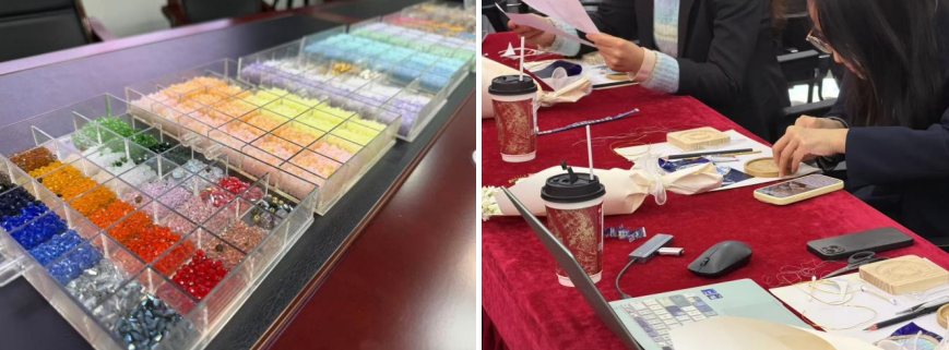 活动现场暖意融融、氛围融洽,精心布置的场地与丰富的手作材料,为女职工们营造出轻松愉悦的创作氛围。活动伊始,专业老师围绕非遗掐丝珐琅的历史渊源、工艺特点及制作流程进行细致讲解,随后,串珠手链制作环节同步开启,老师讲解串珠搭配技巧、编织方法,引导大家发挥创意,打造专属饰品。