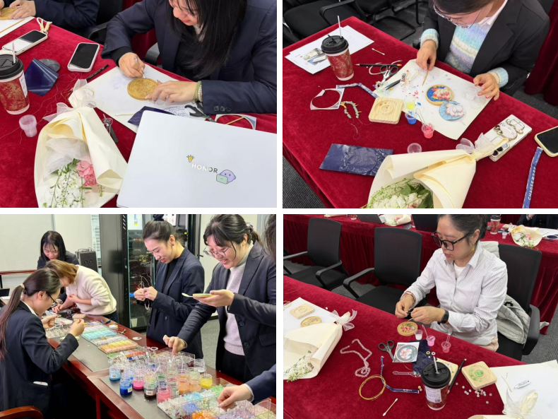 在手工创作环节,女职工们全情投入、各展巧思。掐丝珐琅制作中,大家手持镊子弯折金丝,小心填充彩砂釉料勾勒轮廓;串珠时,精心挑选珠串搭配配色,穿引打结串联成链。指间严谨细致,皆化作匠心之作。过程中,大家相互交流心得、切磋技艺,欢声笑语不断,在互帮互助中增进情谊,充分展现出积极向上、精益求精的巾帼风采。经过一番精心创作,一件件色彩绚丽、创意十足的掐丝珐琅作品,一条条精致秀美、寓意美好的串珠手链陆续诞生。大家纷纷表示此次活动既放松了身心、陶冶了情操,又近距离感受了非遗文化的深厚底蕴,收获满满、意义非凡。