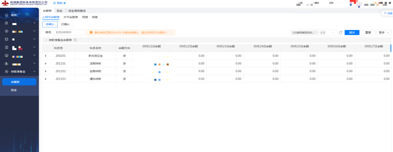 二、存款准备金“余额表”模块。该模块能够展示每日吸收存款余额、自动计算存款准备金、自动计算