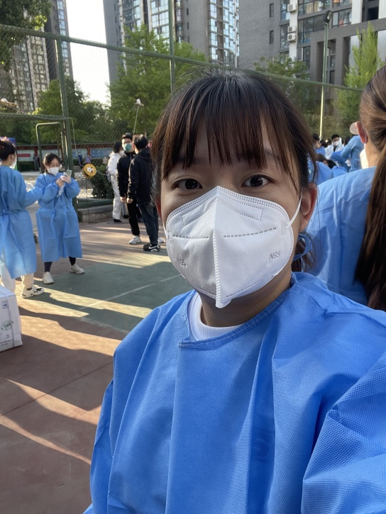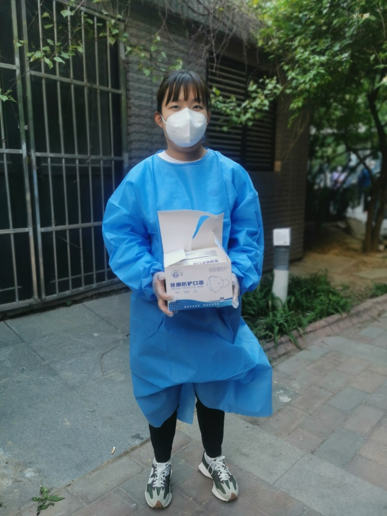后从早6:30开始了一天的辛勤“工作”。她蓝色的身影在小区核酸检测点忙碌着,主要负责给居民分发N95