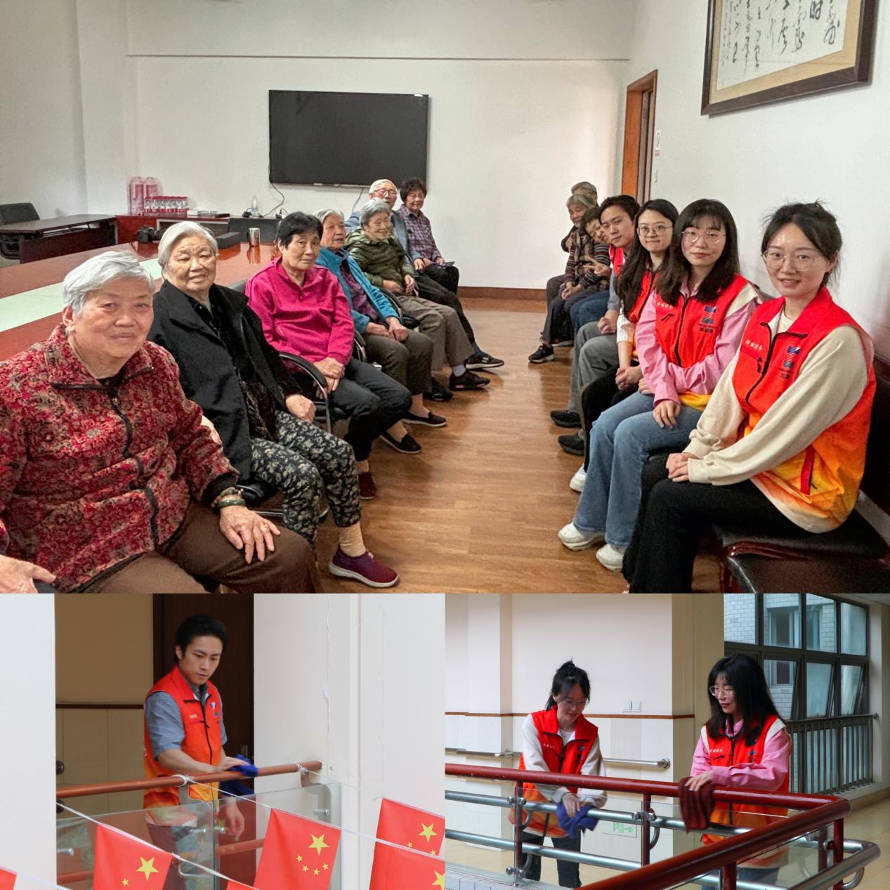 在拱墅区老人公寓,浙能财务公司志愿者们身着统一服装、手持清扫工具,在公区里擦栏杆、抹桌子,确保每一