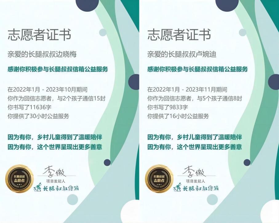 与7个孩子回信23封,累计回信字数超过2万字,志愿活动时长近50小时。