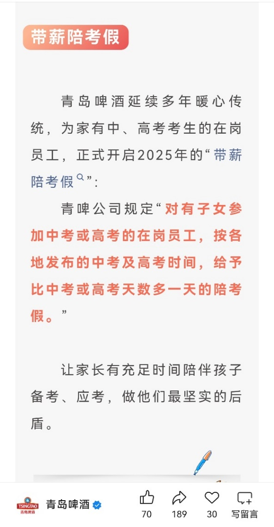 青岛啤酒财务有限责任公司积极响应国家对职工家庭关怀的号召,在集团的政策支持下,正式开启2025年度“陪考假”。这一政策规定,凡是子女参加中高考的在岗员工,均可享受比考试天数多一天的陪考假期。公司旨在通过此举,让员工能够全心全意为孩子做好后勤服务,缓解考生和家长的压力,助力他们更好地陪伴子女迎接人生中的重要挑战。