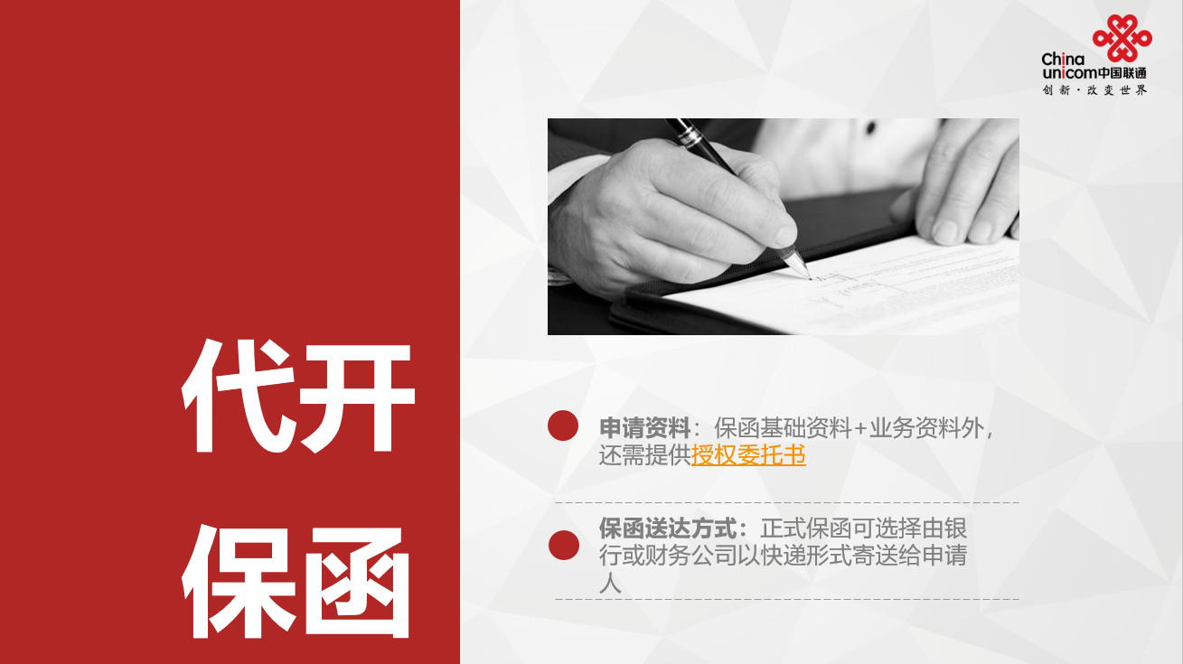 联通集团财务有限公司根据集团内成员单位业务需求,与多家商业银行开展了分离式保函业务,即财务公司作为担保人,申请为集团内分子公司开立银行保函。该业务可以解决中国联通集团成员单位在办理银行保函业务过程中遇到的诸多难题。