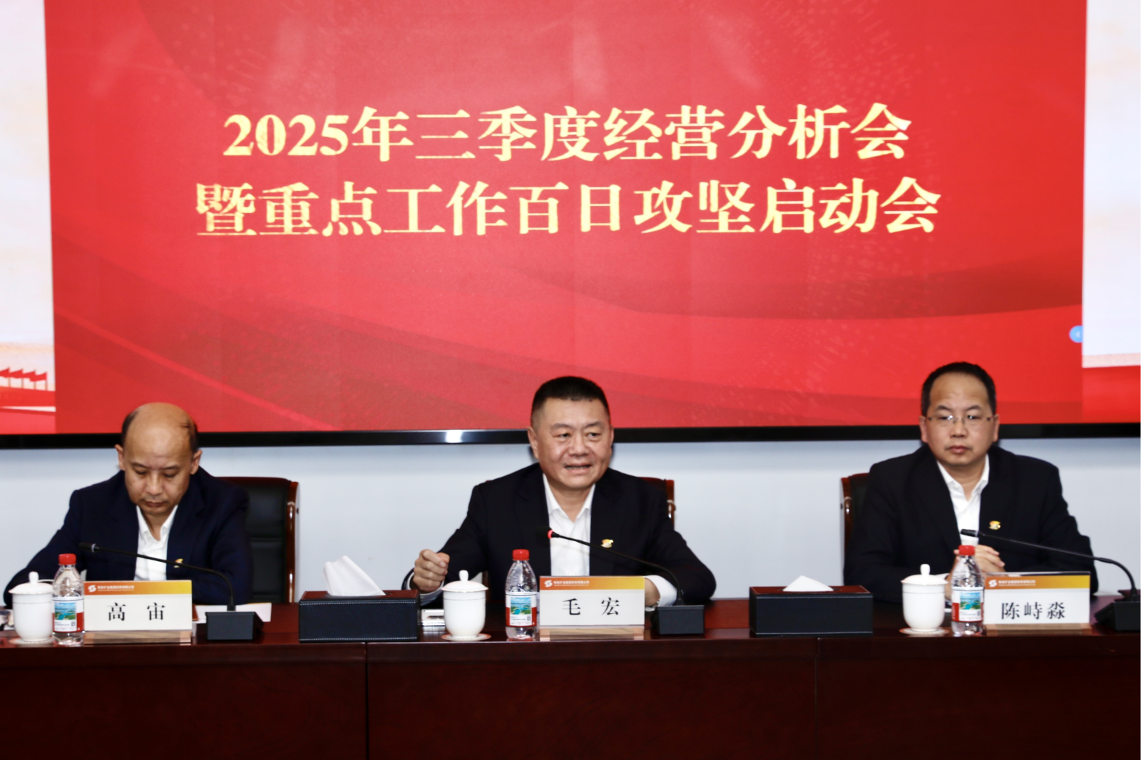 10月20日,中国有色矿业集团财务有限公司(以下简称公司)召开2025年三季度经营分析会暨重点工作百日攻坚启动会,深入贯彻落实集团公司三季度经营分析会精神,分析形势、明确任务,研究部署下一阶段重点工作。公司党支部书记、董事长毛宏出席会议并讲话,党支部副书记、陈峙淼主持会议并作公司三季度经营运行分析报告,党支部委员、副总经理高宙传达集团公司三季度经营运行分析会暨改革深化提升行动高质量收官推进会精神,党支部委员、总经理助理邬天佑通报公司三季度经营指标和重点工作完成情况,并专题宣贯《公司2025年重点工作百日攻坚行动方案》。