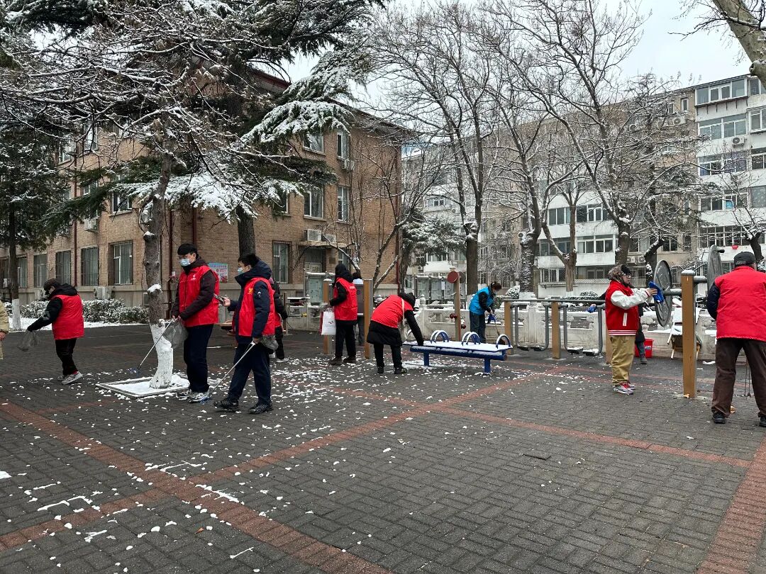 活动当天,志愿者们在和平西苑社区集合。明确分工后,志愿者们迅速开始清扫积雪、清洁社区环境。大家分组协作,认真清扫社区道路、长椅上的积雪,保障居民出行安全;同时,仔细擦拭健身器材、栏杆等设施表面的积雪。部分小组进入绿化带,清理白色垃圾。