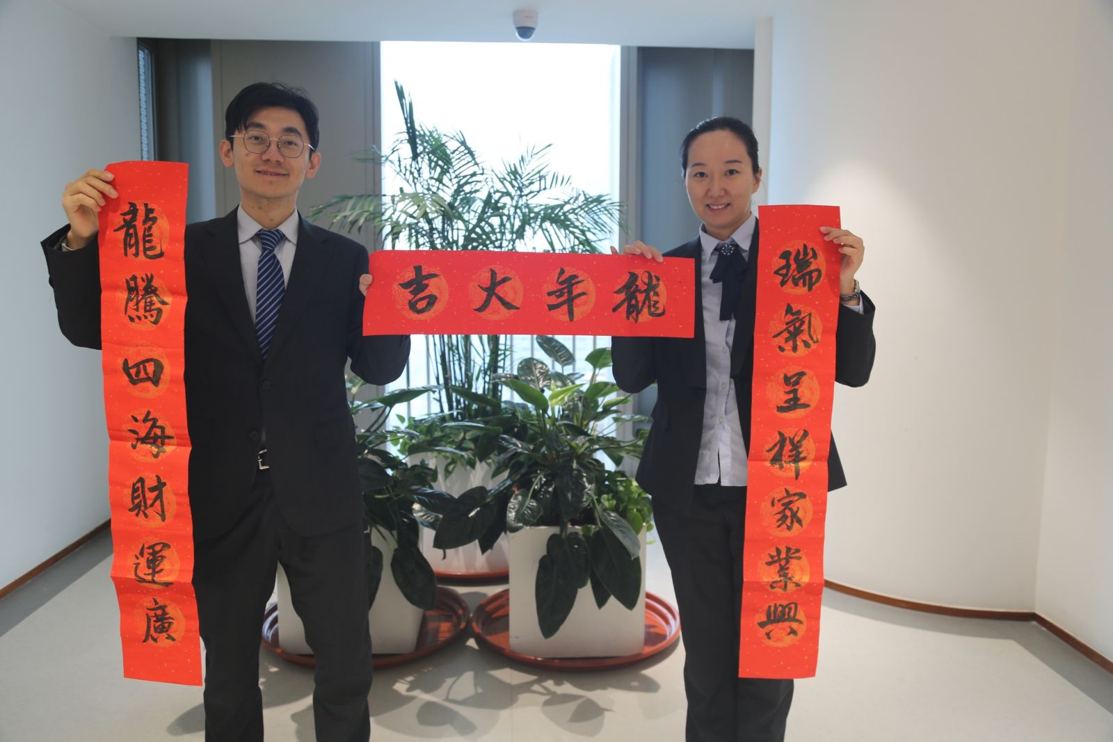 “老师,帮我用黑色墨汁写一副‘瑞气呈祥家业兴,龙腾四海财运广,龙年大吉’的春联吧!”“我想要一副