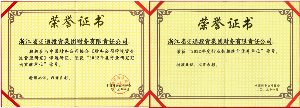 近日,浙江交投财务公司获得中国财务公司协会的多项表扬及表彰,被评为2022年度行业研究突出贡