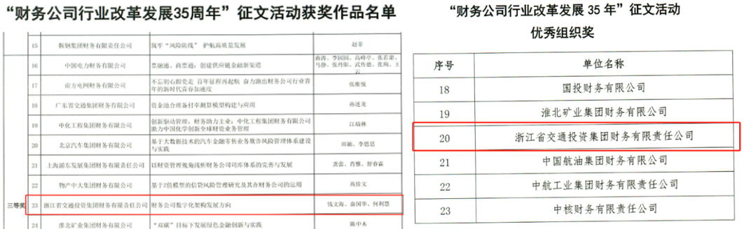 献单位及行业数据统计优秀单位。同时,选送的作品荣获“财务公司行业改革发展35周年”征文比赛三等