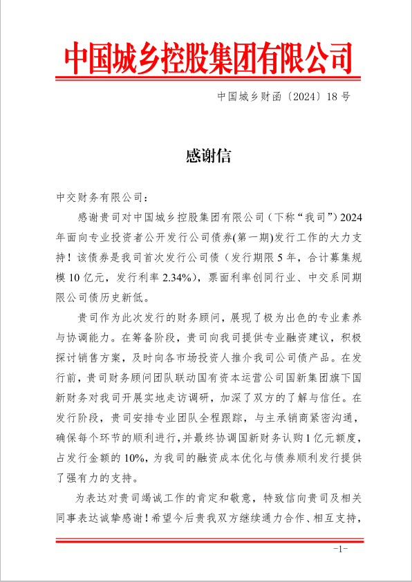 日前,中交财务作为财务顾问协助中国城乡成功发行了票面利率为2.34%的10亿元公司债,票面利率创