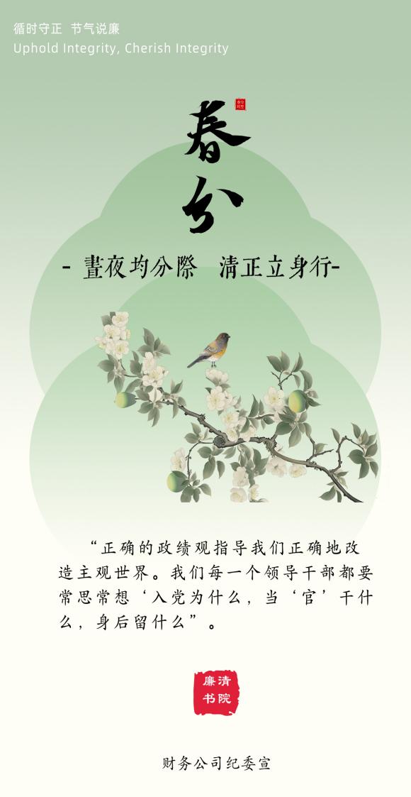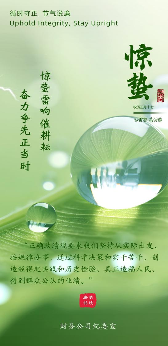 宣教活动遵循习近平总书记关于“两个结合”的重要思想,以二十四节气为脉络,融传统文化、廉政理念和正确政绩观为一体,设计创作廉洁文化主题海报,依托财务公司“清廉书院”平台,按时序、节气推送蕴含“GREEN清廉文化”的系列廉洁文化作品,引导党员干部从中华优秀传统文化中汲取廉洁养分与实干智慧,在四时更替的自然节律中涵养清风正气、厚植为民情怀,树立“功成不必在我,功成必定有我”的正确政绩观,把廉洁自律、勤政有为的要求融入日常,做在平常。