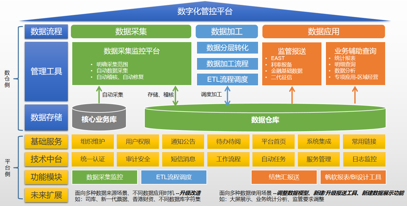 控平台建设。2021年初步实现业务资产梳理和数据归仓,满足金融基础数据、EAST、利率报备监管报送,2022