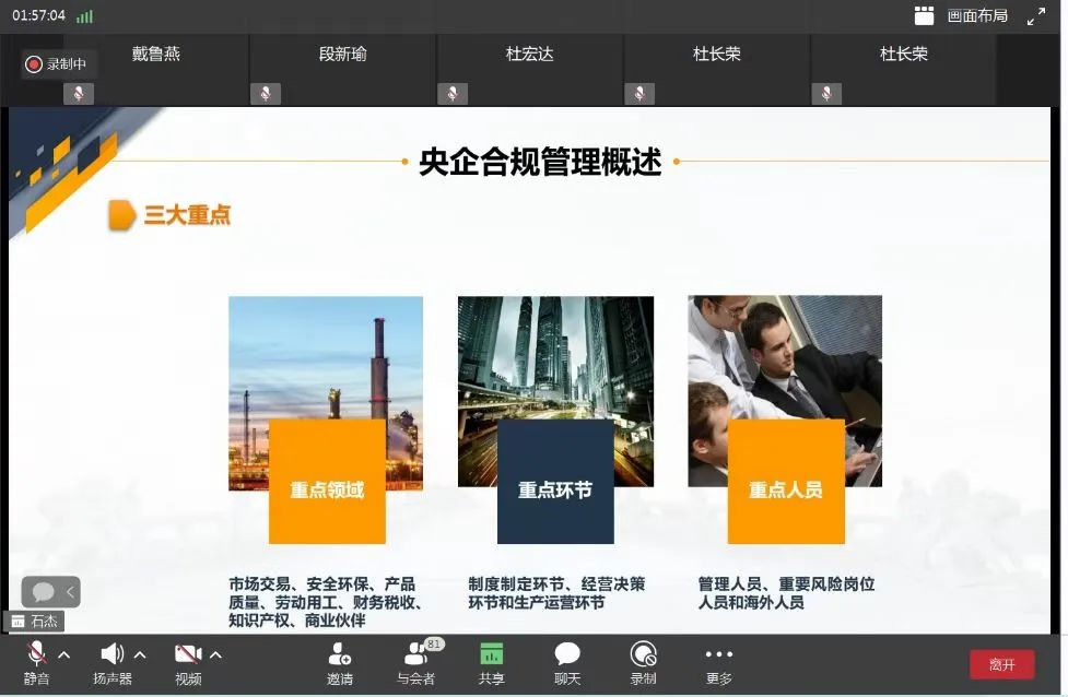 公司以线上方式组织全体员工参与合规讲堂,邀请中伦律师事务所石杰律师作专题合规培训,公司风险管理部