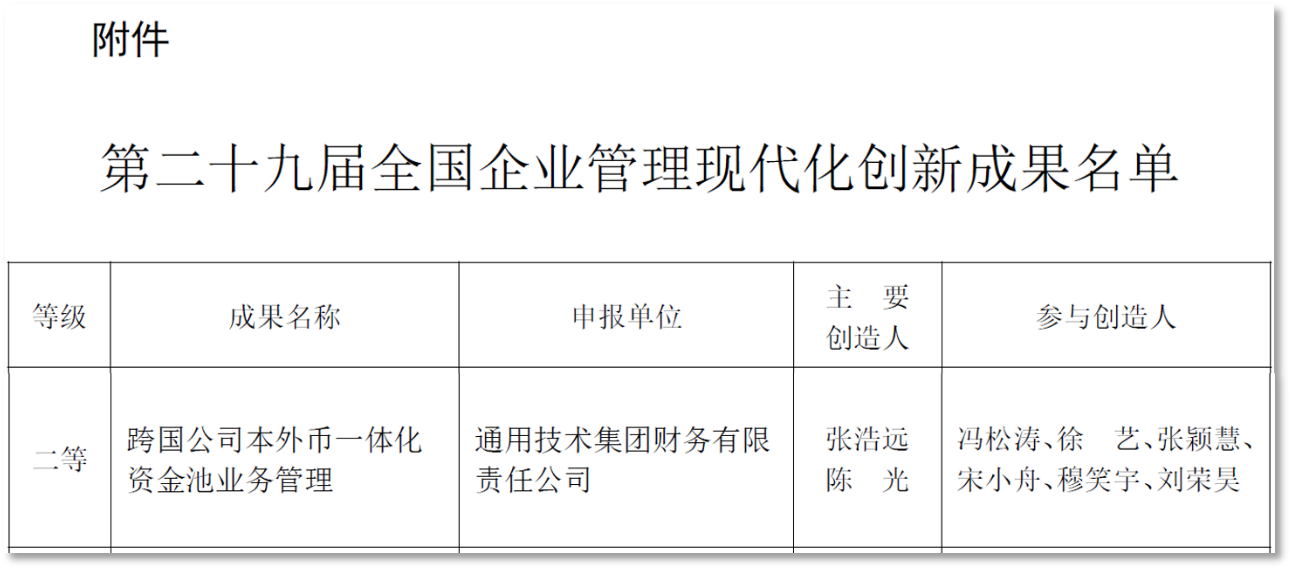 司《跨国公司本外币一体化资金池业务管理》荣获“第二十九届全国企业管理现代化创新成果”二等奖。
