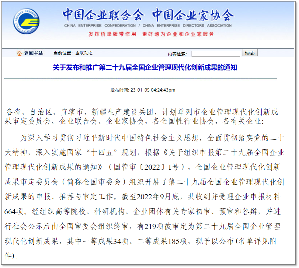 根据《关于组织申报第二十九届全国企业管理现代化创新成果的通知》(国管审〔2022〕1号),全国审