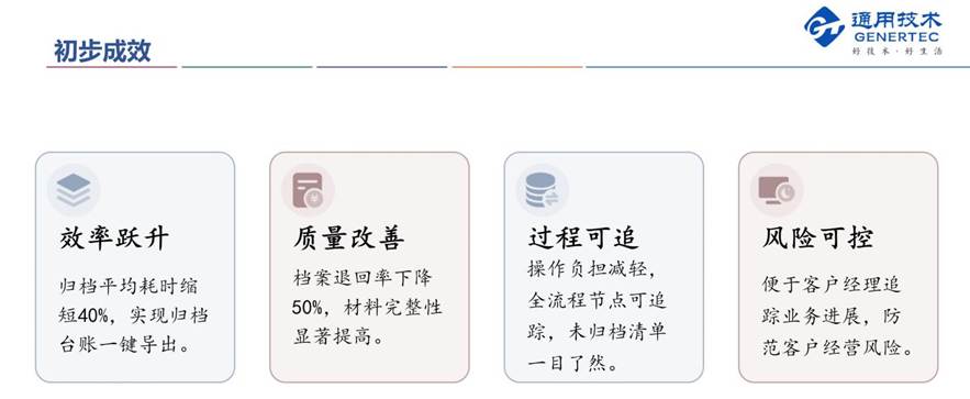 项目上线后已取得显著成效,用户部门表示:归档平均耗时缩短40%,实现了归档台账一键导出,工作效率大幅跃升;档案退回率下降50%,材料完整性显著提高;全流程节点可追踪,未归档清单一目了然,有效减轻了档案员操作负担;客户经理能够实时追踪业务进展。这标志着财务公司在信贷后台管理领域实现了从“人力驱动”到“数字驱动”的关键跨越。