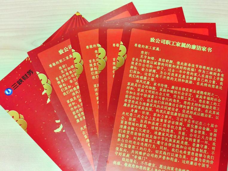 清风送廉,家书传情。2月2日,为进一步筑牢廉洁防线,三峡财务公司党委向公司全体职工家属制作发放了廉洁家书,