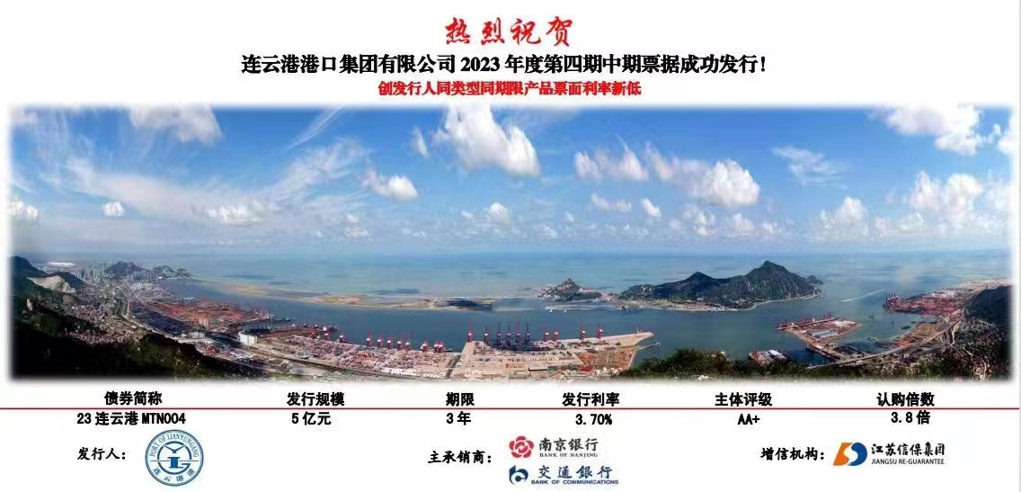 2023年6月8日,港口财务公司助力连云港港口集团2023年度第四期中期票据(简称“中票”)成功