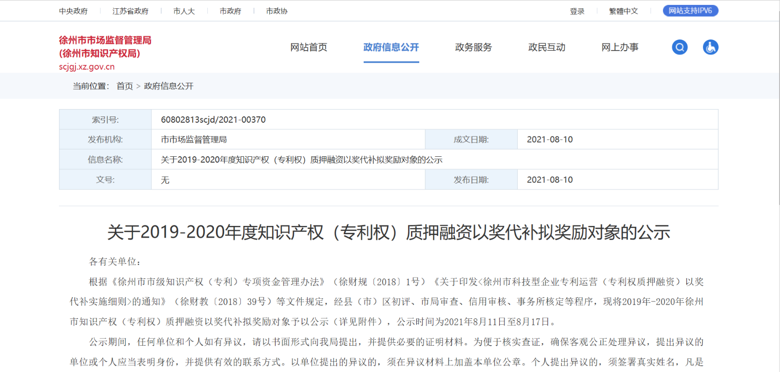 日前,徐州市市场监督管理局对2020年徐州市知识产权(专利权)质押融资以奖代补奖励对象予以公示,在徐工财务公司的积极办理申请下,共有8家成员单位获得奖补资金共计225万元。