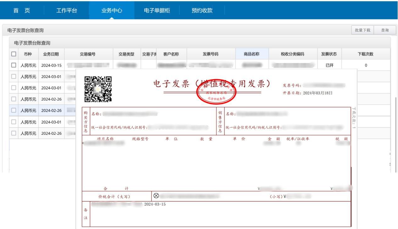 下载贷款业务记录及对应发票,实现业务、账务、税务、发票的“一站式”闭环处理,全过程无需申领,无需税控盘、