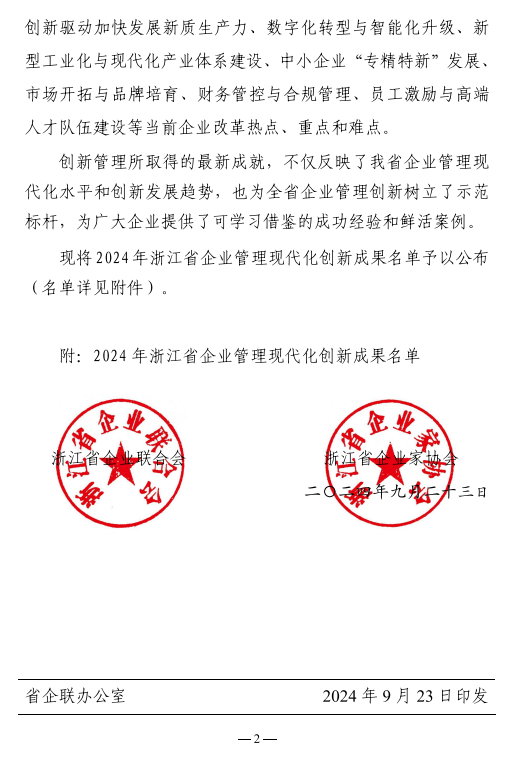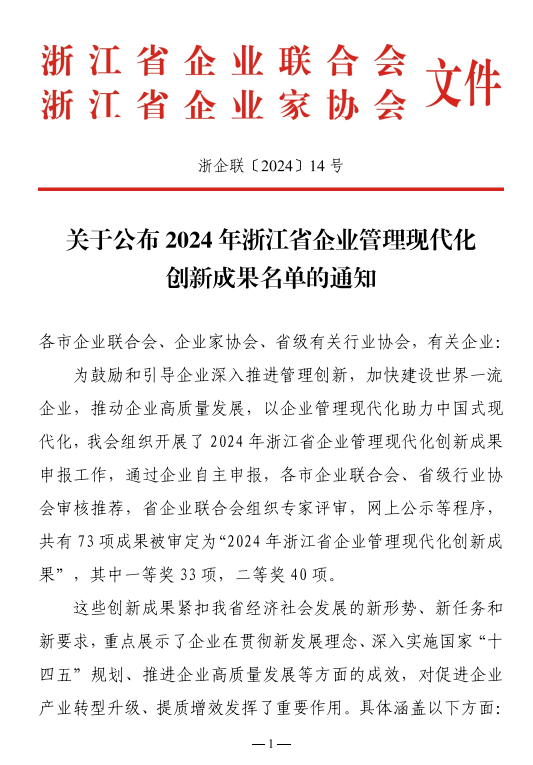企业联合会组织专家评审,网上公示等程序,共有73项成果被审定为“2024年浙江省企业管理现代化创新成