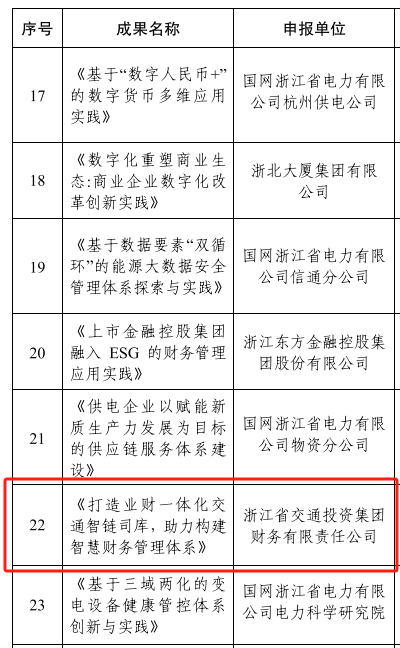 近日,2024年浙江省企业管理现代化创新成果获奖名单正式发布,浙交投财务公司《打造业财一体化交通