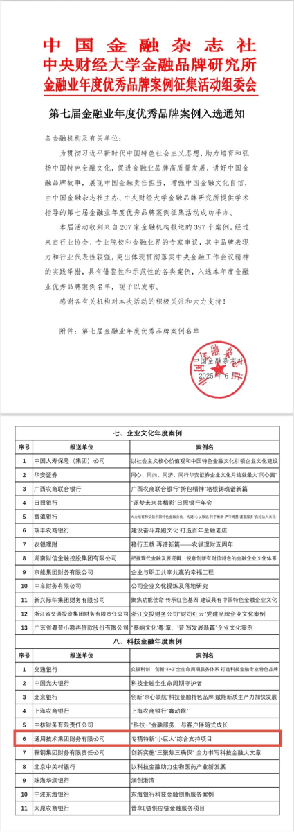 近日,由《中国金融杂志》举办的第七届金融业年度优秀品牌案例评选活动落下帷幕,通用技术财务公司报送的财务顾问服务案例《专精特新“小巨人”综合支持项目》成功入选。财务顾问服务是通用技术财务公司为服务集团成员企业而定制的综合性产业金融业务。财务公司在有效整合集团现有金融资源的基础上,发挥平台优势和牌照优势,搭建起成员单位和资本市场之间的桥梁,充分撬动外部资源,优化成员单位投融资结构,为成员单位提供定制化金融服务。下一步,财务公司在做好通用财务品牌宣传的同时,将继续深耕成员企业发展需求,为实现集团总体效益最大化贡献力量。