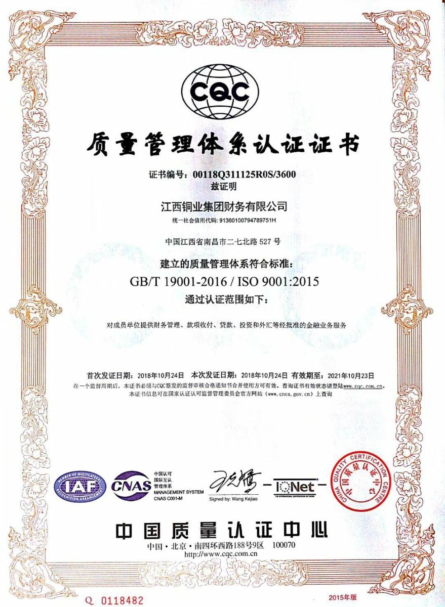 近日,江铜财务公司通过中国质量认证中心总部的认证注册资格审核,于10月24日正式获得该中心颁发的ISO9001:2015质量管理体系认证证书。