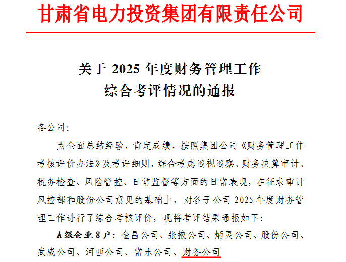 近日,集团公司2025年度财务管理工作综合考评结果正式公布。甘肃电投财务公司凭借扎实的财务管理基础、突出的工作成效与专业的服务能力,再度获评财务管理“A级企业”。这是公司成立十年来,第九次斩获此项荣誉,不仅彰显了集团公司对公司财务管理工作的认可,更印证了公司在建设一流财务管理体系道路上的深厚积淀与持续突破。