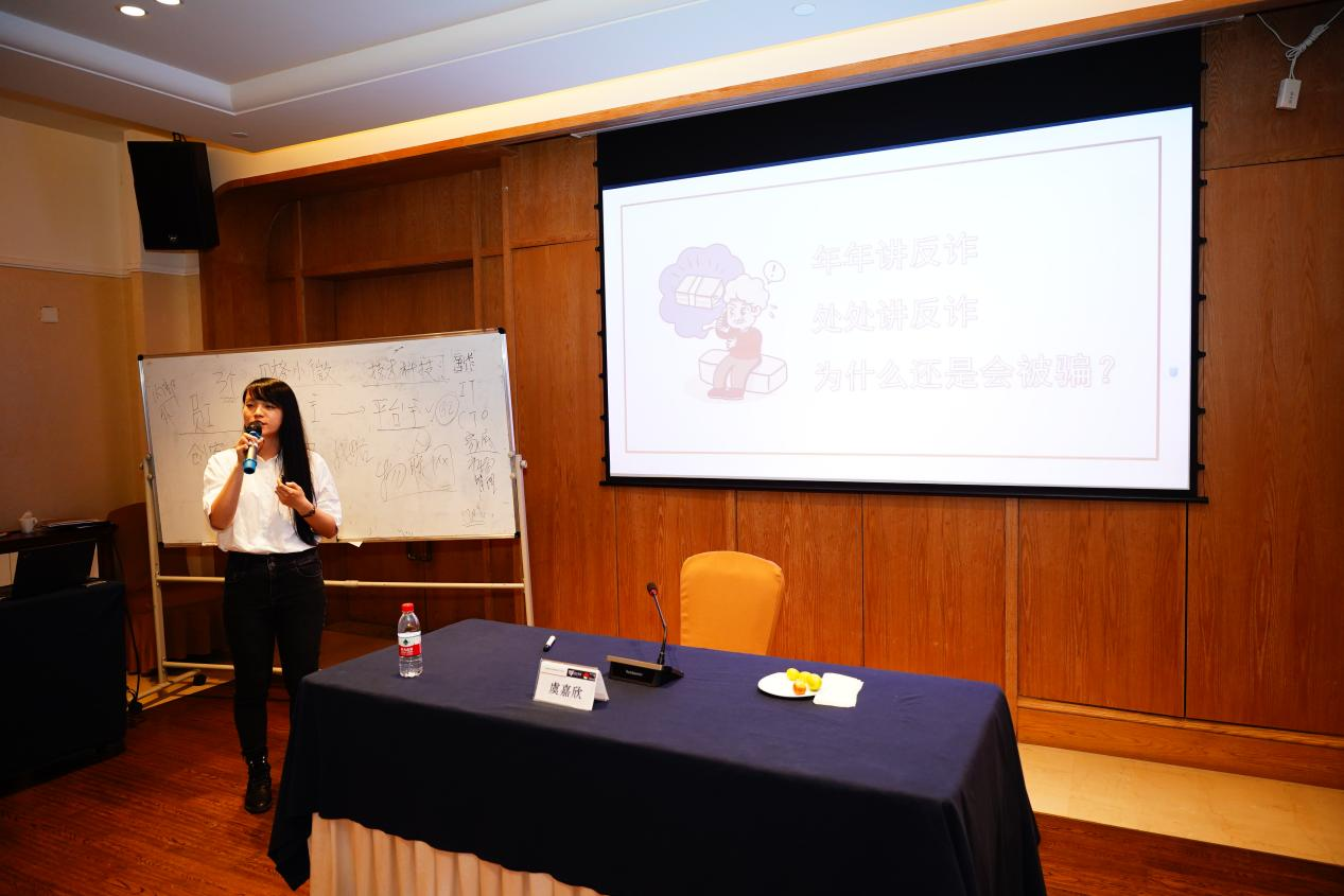 图为财务公司风控部主管、财兜兜反诈志愿者虞嘉欣作反诈、反洗钱宣讲