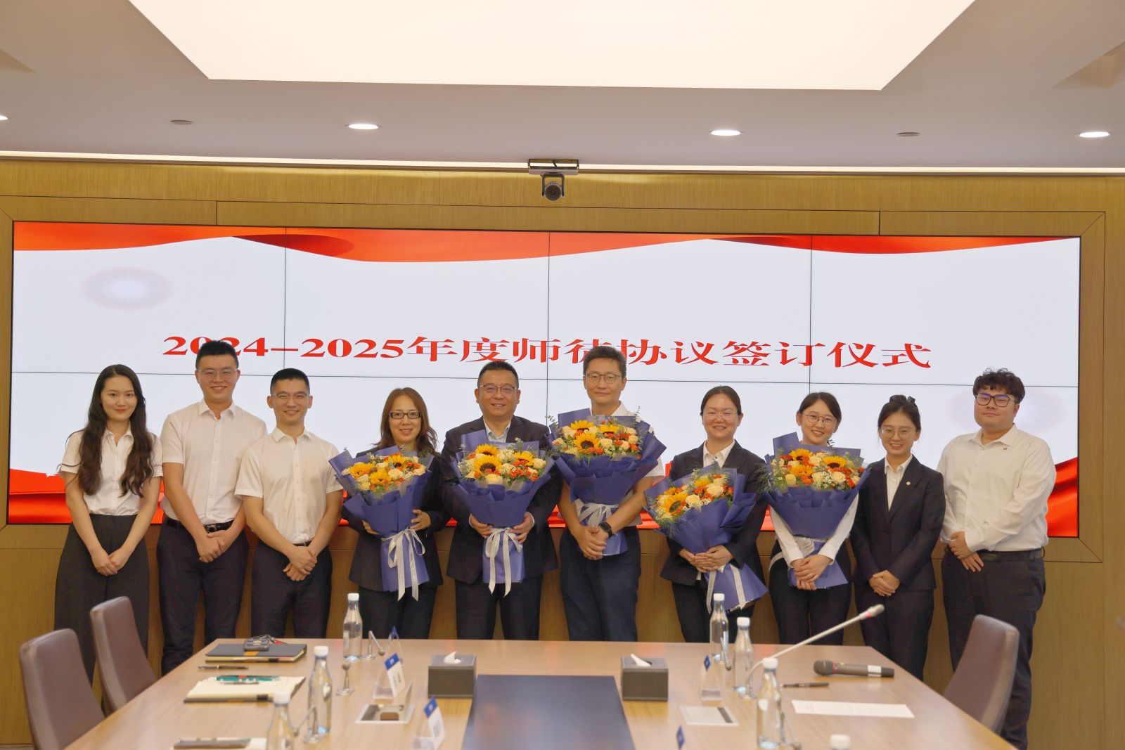 新结对师徒签订了2024-2025年度“导师带徒”协议,并进行表态发言。徒弟们向导师献上鲜花并合影留