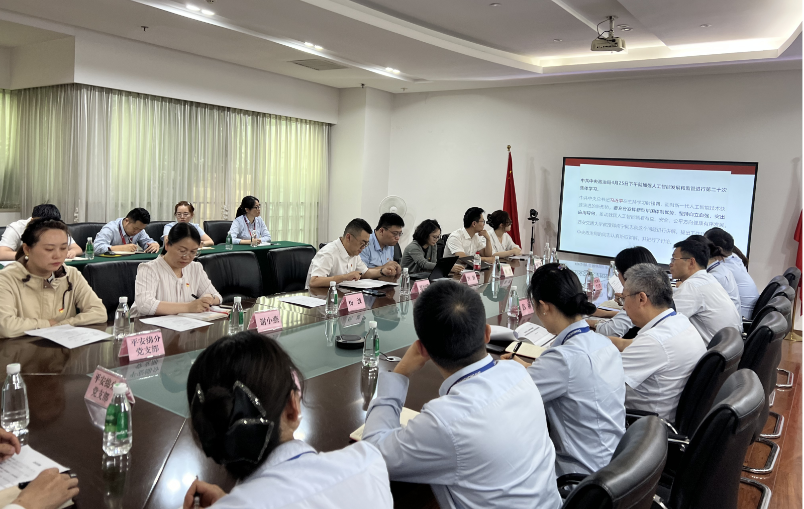 随后,双方党员干部共同开展了“第一议题”学习,学习了习近平总书记关于加强人工智能发展和监管的重要讲话,以及其在上海和河南洛阳考察时作出的重要指示精神。通过全面、系统的学习,党员干部们进一步加深了对国家发展战略的理解,为后续工作的开展指明了方向、奠定了思想基础。